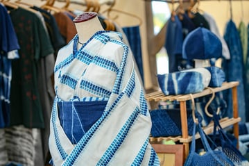 藍は徳島産のものを用い昔ながらのやり方で染め、自分らしい絞り染めが良い形になるように製作しています。